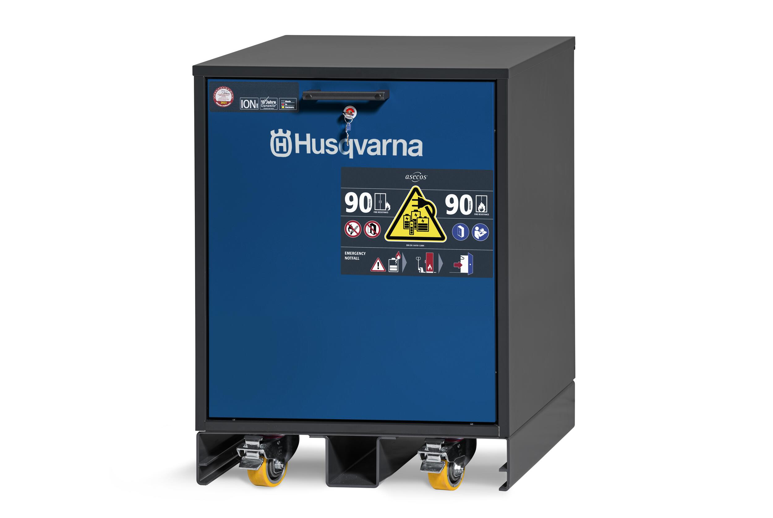 Husqvarna Battery Charging Cabinet S is engineered for safe and approved storage and charging of lithium-ion batteries. This 230V under-bench cabinet can easily be placed under worktops due to its low height and offers 90 minutes of fire resistance from the outside in and from the inside out*. Equipped with a smoke detector, providing early detection of incipient fires, and a potential-free alarm system that ensures that on-site alarms are promptly forwarded. Ready-to-use outlet strips and shelves are included.