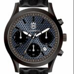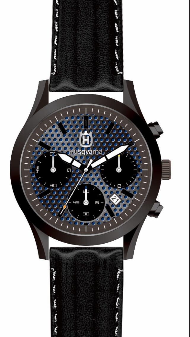 Schwarzer Chronograph mit Armband in Lederoptik und Husqvarna Logo auf dem Ziffernblatt.