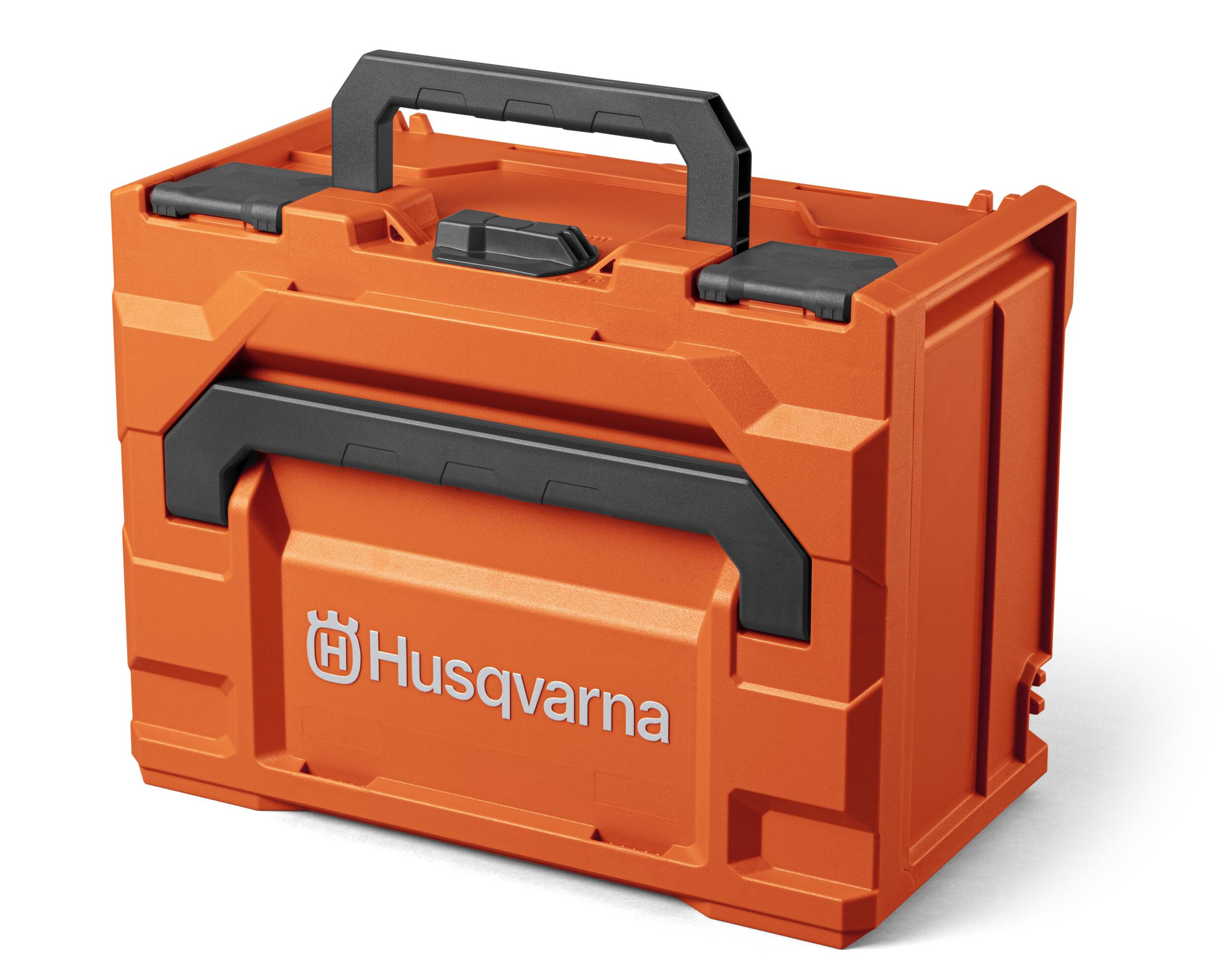Die Husqvarna Akku Box M&L ist eine robuste und handliche Box für den Transport und die Aufbewahrung von bis zu 3 Stück Husqvarna 36 V Größe M* plus 3 Stück 36 V Größe L** Lithium-Ionen-Batterien. Ergonomische Griffe vorne und oben für eine einfache Handhabung. Das durchdachte Design ermöglicht das Stapeln mehrerer Boxen und durch Hinzufügen der Husqvarna Multi-Adapterplatte (separat erhältlich) kann die Box auch an Koffersysteme von Drittanbietern angeschlossen werden.