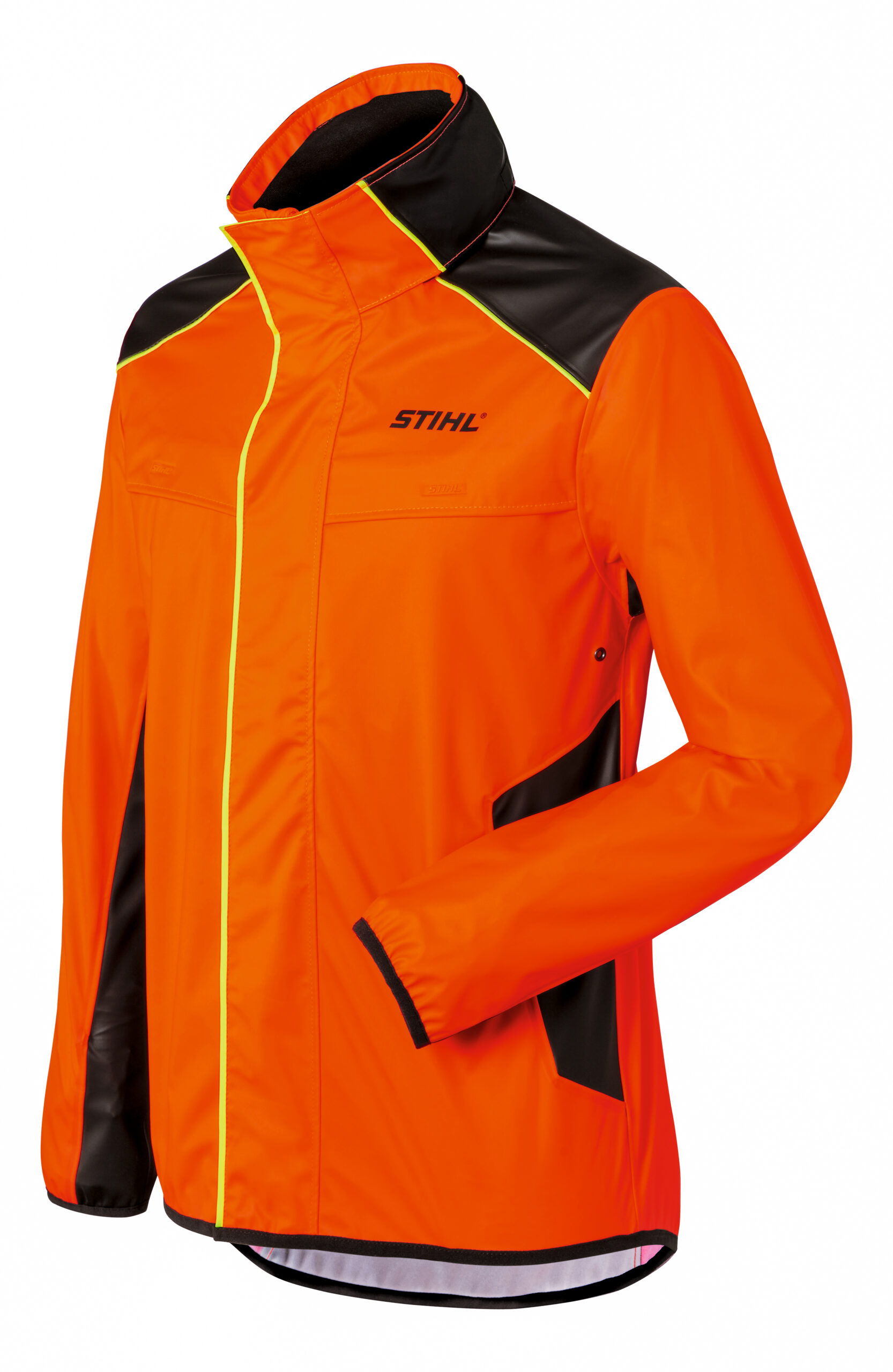 Aus wasserdichtem, elastischem und strapazierfähigem Material. Farbe Warnorange, Oberstoff: 100 % Polyester, Beschichtung: 100 % Polyurethan. Hoher Warnorange-Anteil. Wassersäule: ≥ 5.000 mm. Atmungsaktiv durch Belüftungsöffnungen am Ärmel, sowie am Vorder- und Rückenteil. Im Kragen verstaubare Kapuze. Derzeit in KWF-Gebrauchswertprüfung.