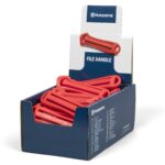 Feilengriff mit patentiertem Arretierungssystem. Geeignet für Rundfeilen der Größe 4.0 – 4.5 mm sowie für 6″ und 8″ Flachfeilen. Eine 25˚ und 30˚ Lehre erleichtert Ihnen das Beibehalten des richtigen Feilwinkels.