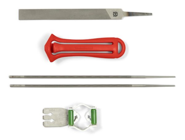 Komplettes Kit, das Ihnen hilft Ihre Kette immer in Form zu halten. Bestehend aus Feilengriffen, Kombilehre, 2 Rundfeilen und 1 Flachfeile. Es ermöglicht Ihnen ein einfacheres Arbeiten durch den richtigen Feilwinkel.