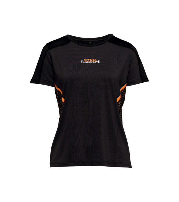 Das Shirt ist im Color Block Stil in Schwarz, Dunkelgrau und STIHL Orange gestaltet. Mit dezenter Taille. Auf der Brust prangt ein TIMBERSPORTS ® Logo in den Originalfarben. Die Ärmel sind mit kleinen gedruckten Äxten verziert.