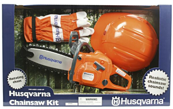 Set inklusive Spielzeug-Kettensäge mit authentischen Geräuschen und sich bewegender Kette, Schutzhandschuhen und einem Schutzhelm aus Plastik. Verpackt in praktischer Geschenkbox.