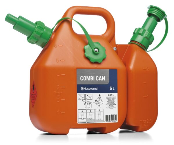 Kombikanister mit effektivem Kraftstofffüllschutz: Bei vollem Tank wird die Zufuhr gestoppt und der Kanister kann ohne Verschütten hochgehoben werden. Die Kanister können voneinander getrennt werden. Zwischen den Kanistern ist Platz für Feilen und Werkzeug.