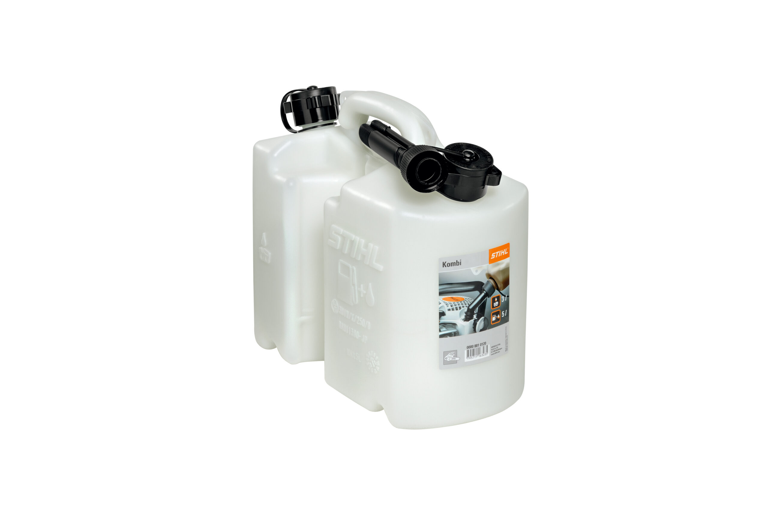 Zum Transport für 5 l Kraftstoff und 3 l Sägekettenhaftöl. Mit UN-Zulassung, Farbe: orange/transparent. Zwei kindergesicherte Verschlüsse, inkl. Auslaufrohr.