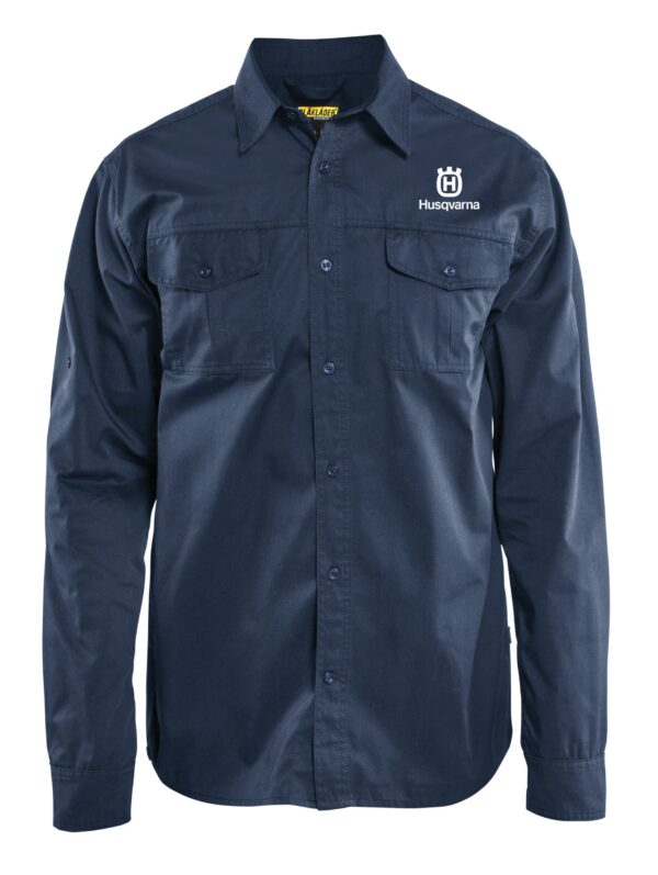 Lockerer Schnitt. Brusttasche mit Klappe und Stifttasche. 65% Polyester, 35% Baumwolle, Twill. Mit Husqvarna Logo.
