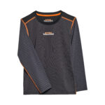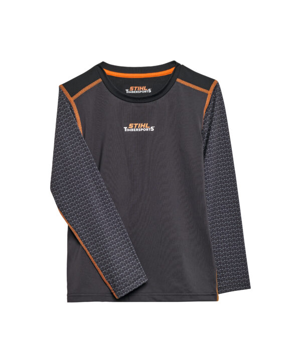 Ab in den Wald! Am besten in diesem Funktionsshirt für Kinder. Das Shirt ist im Colour Block Stil in Schwarz und Dunkelgrau gestaltet. Auf der Brust prangt ein TIMBERSPORTS ® Logo in den Originalfarben. Die Ärmel sind mit kleinen gedruckten Äxten verziert. Die Nähte sind in STIHL Orange abgehoben.