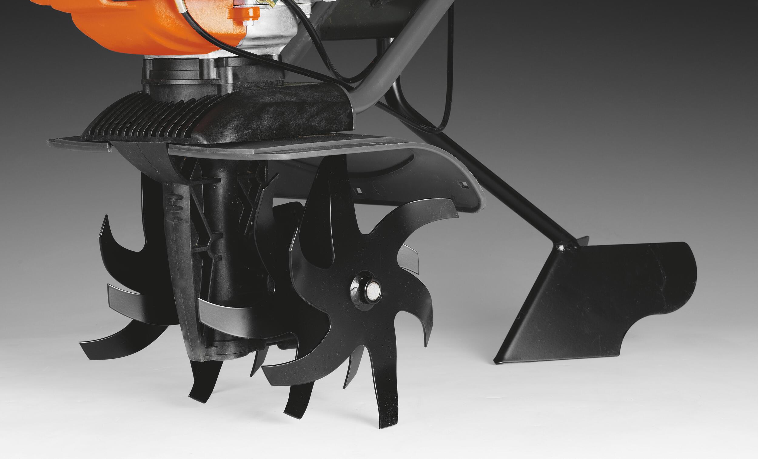 Benutzen Sie Ihre Motorhacke zum Umpflügen Ihrer Beete mit dem Pflugzubehör.