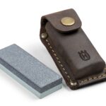 Kleiner Siliziumkarbid-Schleifstein zum Schärfen von Äxten. Doppelkörner (grob und fein) für schnelles oder feines Schärfen. Kann sowohl trocken als auch mit Öl oder Wasser verwendet werden. Kommt mit einem Lederetui.