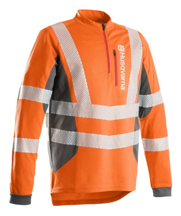 Mit Reißverschluss vorne, verlängertem Rücken, leicht zugänglicher Fronttasche und Reflektorstreifen ist dieses gut sichtbare Langarm-T-Shirt gemäß ISO EN 20471 (Klasse 2) geprüft und zugelassen. Es hält auch Feuchtigkeit vom Körper fern.