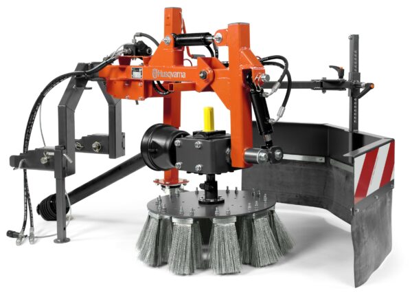 Zapfwellenbetriebene Wildkrautbürste zum gründlichen Entfernen von Unkraut und Schmutz aus Rinnen, von Gehwegen und an Bordsteinen. Der Bürstenwinkel ist vom Fahrersitz aus einstellbar. Durchmesser 50 cm. Erfordert Hydraulikkit und Heckgewicht.